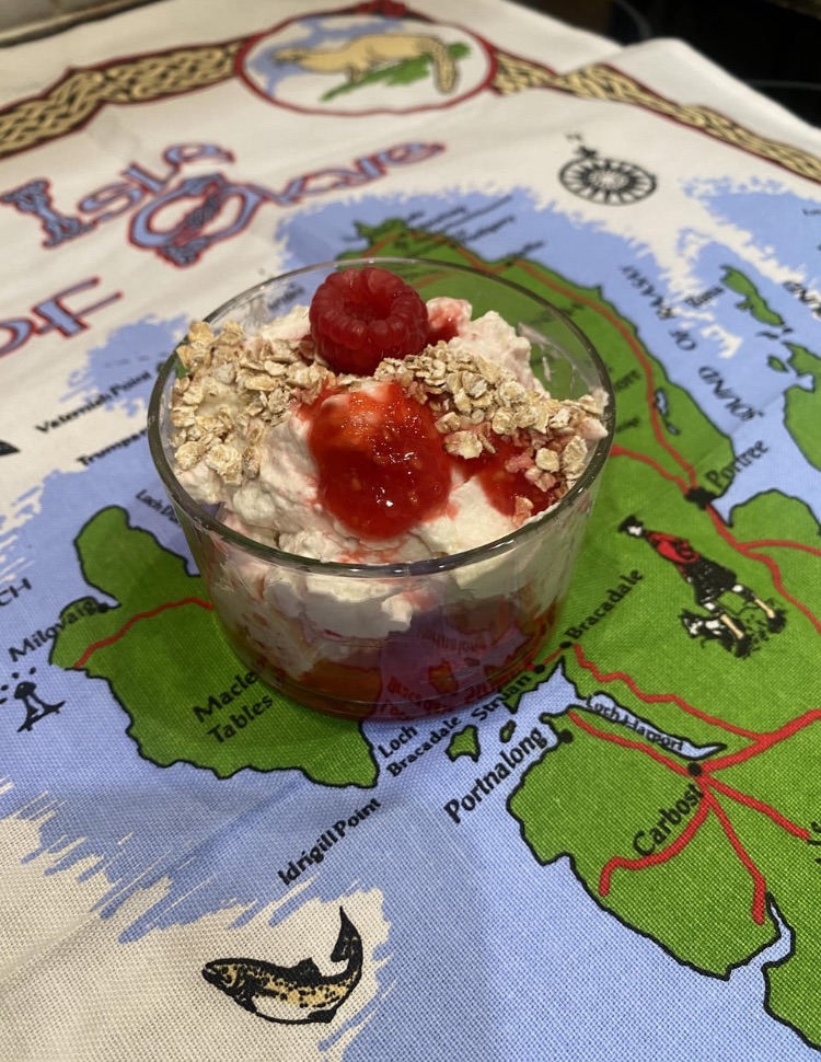 Finally decorate your Cranachan creation with the petticoat tails, raspberries, a sprinkle of the oats or whatever you want.