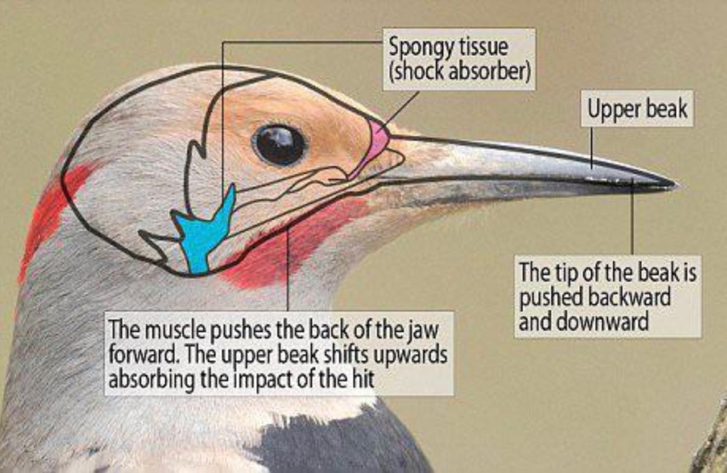 A male Great spotted has been counted drumming up to 600 times a day, at a rate of 10 to 40 strikes a second, and they can only do this without knocking themselves senseless because they have a sort of shock absorber at the base of their beak, as can be seen in the image below. The frequency of strikes, rather than the strength of impact, (although they do strike with a force of up to 100g!), is the reason their drumming can be heard for a long distance away, as they create a resonating effect which amplifies the sound to greater effect.