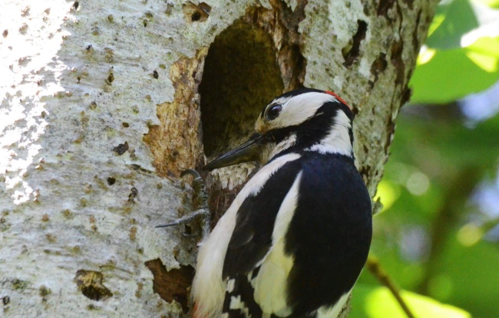A woodpecker’s beak is not only used as a percussive instrument but also as a chisel with which to excavate nest holes, and each year a pair will create a new nest, usually, but not always, in dead wood. This house building takes from 2 to 4 weeks and in the nest the female will lay a clutch of 4 to 6 white eggs, with both the male and female will taking turns to incubate the eggs which hatch after about 12 days. The young woodpeckers fledge at around 20 to 24 days old and stick around with their parents for a further 2 to 3 weeks learning the facts of life, such as how to hunt for food.
