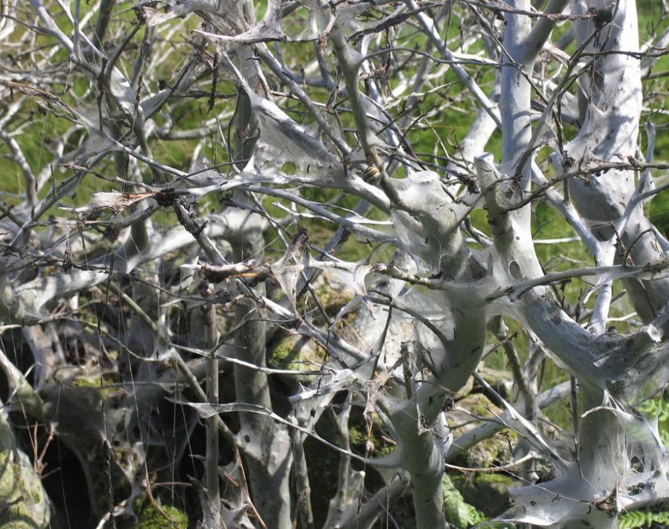 This eerie envelopment will often cover whole stretches of trees and hedgerows, even covering nearby plants which aren’t food plants, occasionally objects like signposts and fences too, looking for all the world like someone has gone a bit mental and sprayed everything with one of those cans of cobwebs you can buy for Halloween!