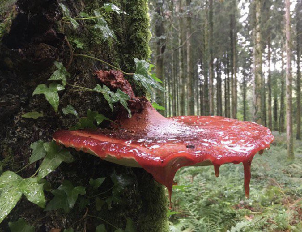 The topside of the fungus is what gives this species its common name, resembling raw meat in both color and texture, this red colouration deepens with age, like the red of a maturing steak does, and when the flesh is cut it is a yellow-pink colour streaked through with red, they also exude a gooey liquid that stains red, sometimes appearing quite gory, as with these specimens found by mycologist Rachel Harries.