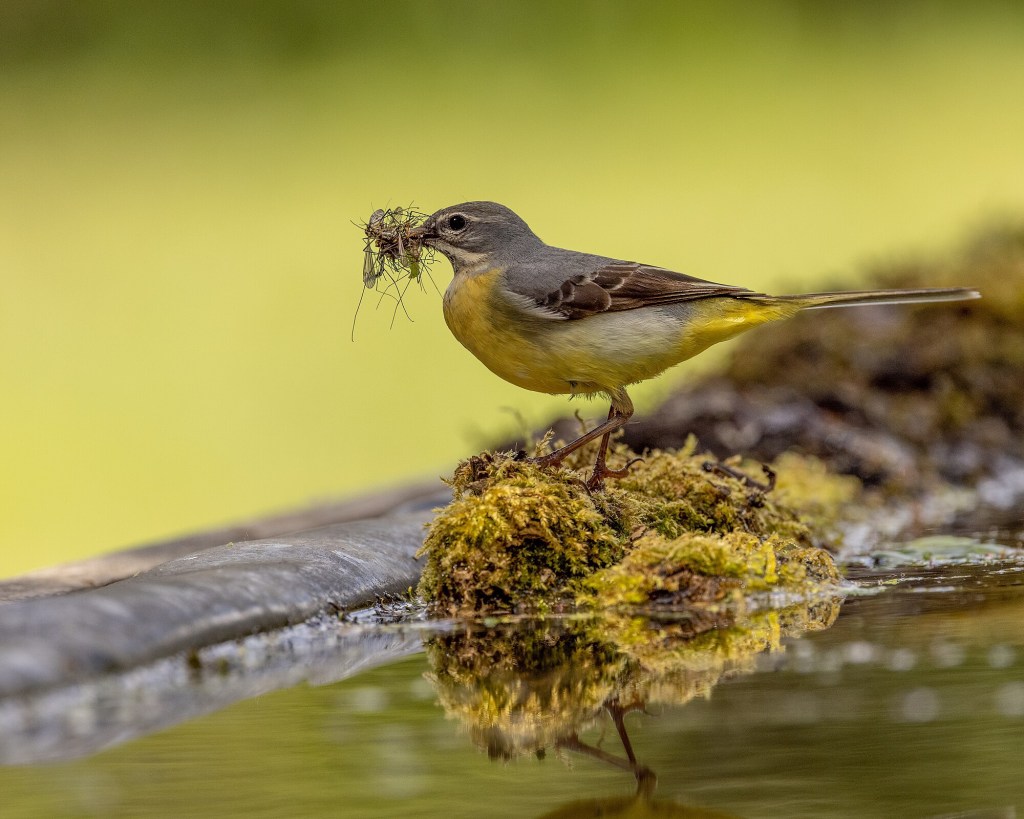 Aquatic insects are what the Grey Wagtail feeds on in its home territories too, with Stoneflies, Caddisflies, Mayflies and their larvae all being favourites, along with anything else the bird can catch.