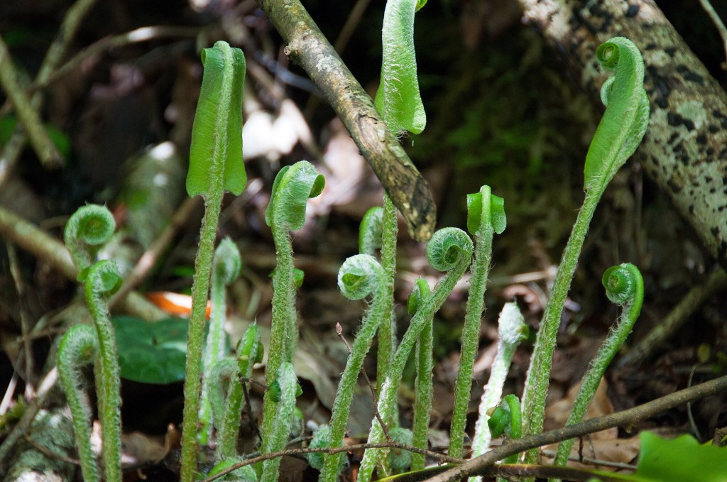 Like all ferns they reproduce by releasing these spores so don’t produce seeds or flowers, this means they require a damp habitat. Hart’s tongue is very tolerant to short periods of exposure though and can recover quickly from being dried out, unlike frilly fronded ferns which are more fragile and will die. It can also grow back quickly after being battered by floods and storms, producing emerald green ‘fiddle heads’ which is what the curled-up new fronds are called.