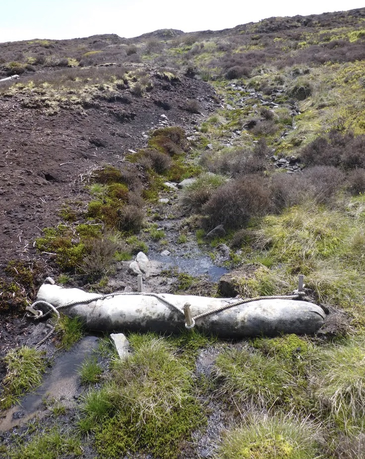 Gullies and drainage ditches can be blocked, this can be done with coir (made of coconut fibres), wool, timber or other materials to flood bogs and create pools and splashes, government grants in the past have paid for hill farmers to dig drainage ditches to create farmland, but now they are paying for them to be blocked again!