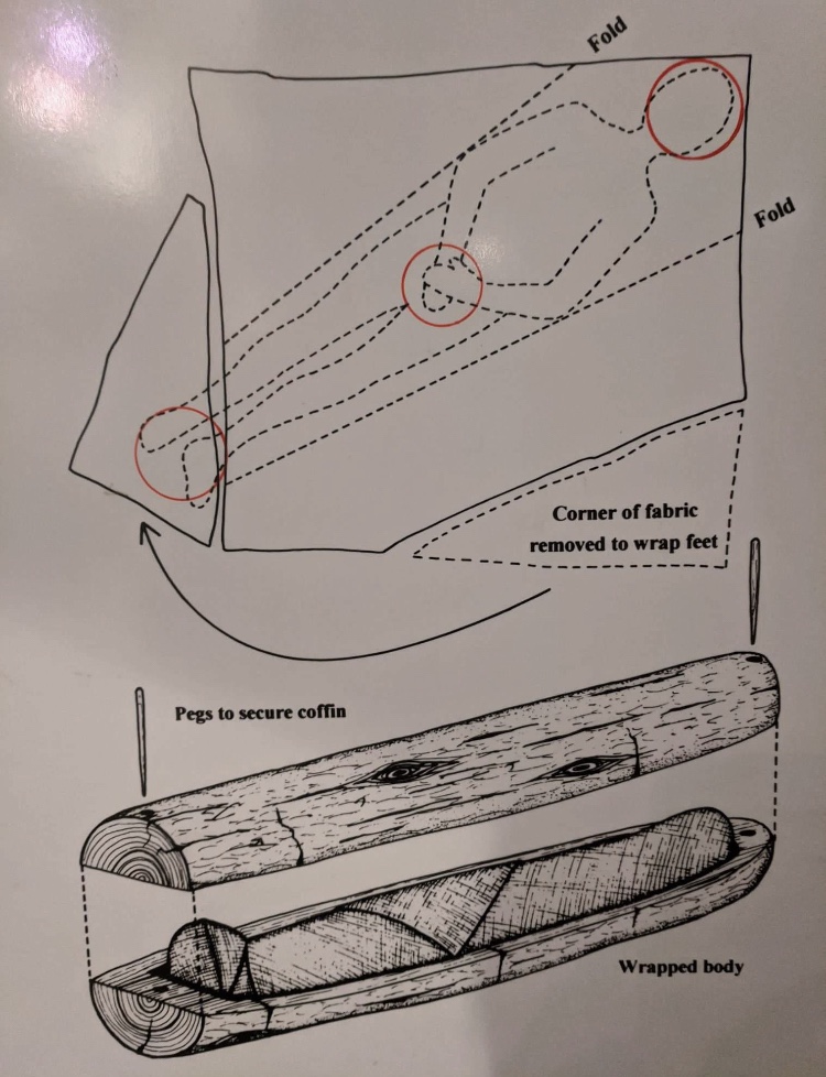Although the square woolen shroud had not been quite big enough to wrap the body in its entirety it still turns out to have been the biggest piece of woolen fabric retrieved intact from the dark ages. Since its discovery the Oak wood of the coffin has been carbon-dated, giving a time frame for the construction of the coffin and the internment of it and its contents within the dark peat of the Bowland Fells.