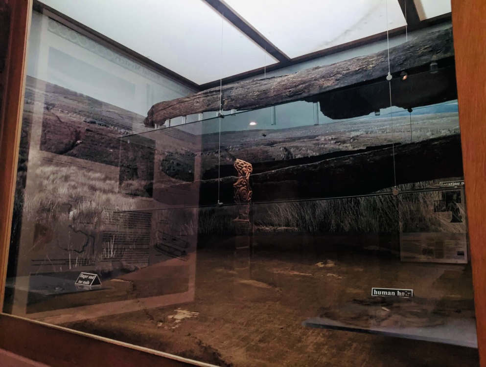 The piece that James Marshall had found was the bottom half, the base, of the coffin, with the other half, the section that had been crushed by the digger, being the top half. Both parts are made out of the hollowed out trunk of an Oak tree and would have originally been pegged together, unfortunately the top half had already received significant damage due to penetration from the roots of heathers and other moorland plants, so the unwitting digger driver wasn’t entirely responsible for its loss!