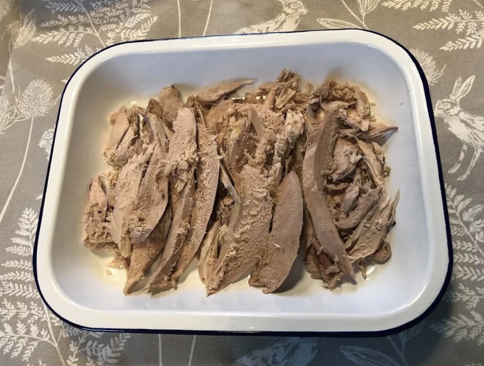 The Pheasant will be cool enough to handle by now so take it and carefully strip off the flesh, you can do this by shredding it lengthways between two forks, then add to it the sauce and simmer at a low heat.