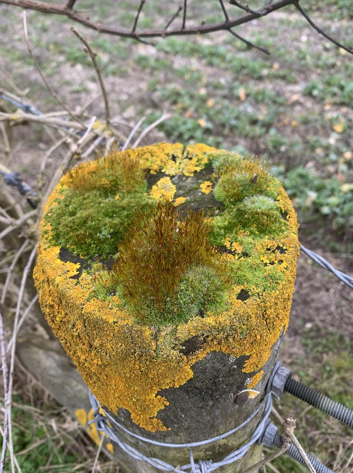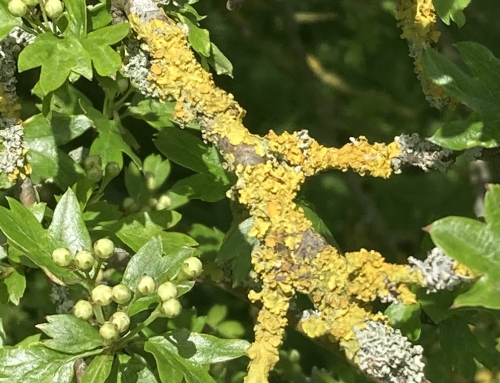 In the world of Lichenology the Sunburst Lichen, Xanthoria parietina is considered a bit of a weed, growing rapidly and spreading to take over, sometimes literally growing over neighbouring, slower-growing or more delicate species of lichens, its scientific name comes from ‘xanthos’, a greek word meaning yellow, and parietina comes from the same root as patina and means ‘of walls’.