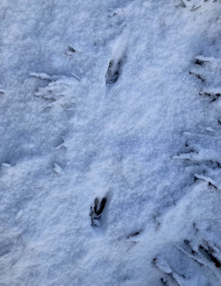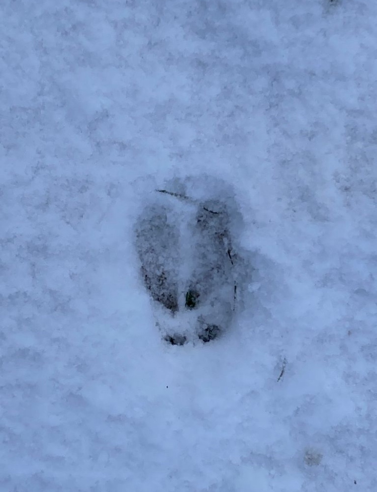 Deer hooves are splayed, meaning they leave two long imprints, called ‘slots’ by hunters, in the snow with a gap in between. It can be hard to tell different species apart, although size can be a clue.