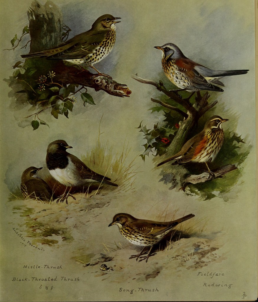 Both its scientific name, Turdus viscivorus and its common name mean ‘the Thrush that eats Mistletoe’ as they have a quite a taste for its sticky white berries and play a very important role in propagating the parasitical plant, Mistletoe is very rare here in the North of England though, more commonly found in the South.