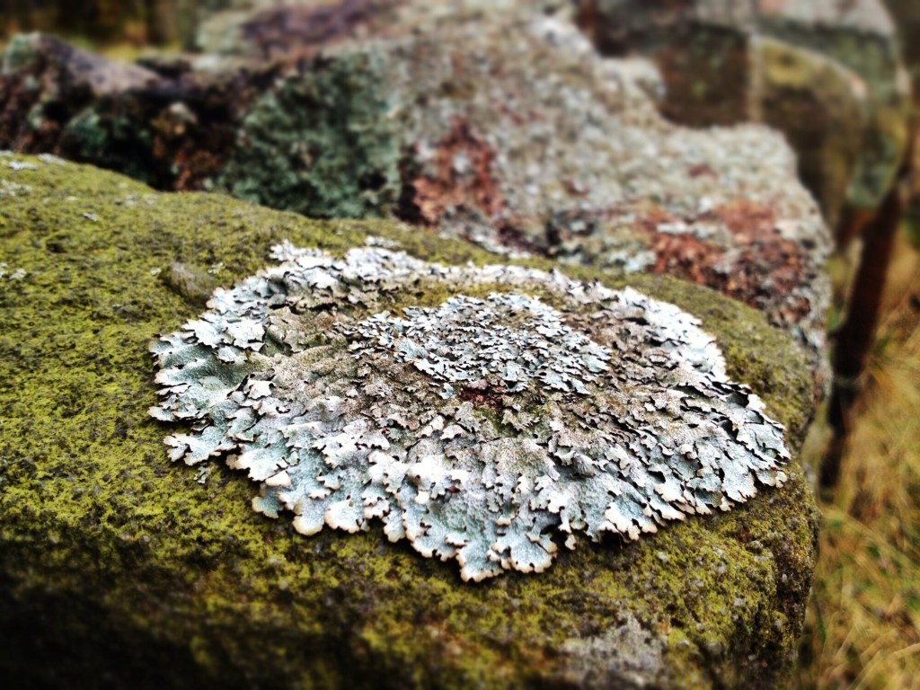 One of the most prevalent species to be found growing here is Parmelia saxatilis, known as Grey Crotal or Crottle. This is a common foliose, (meaning ‘leaflike’), Lichen which grows on rocks on the moors, the second half of its scientific name, saxatilis, means ‘living among rocks’.