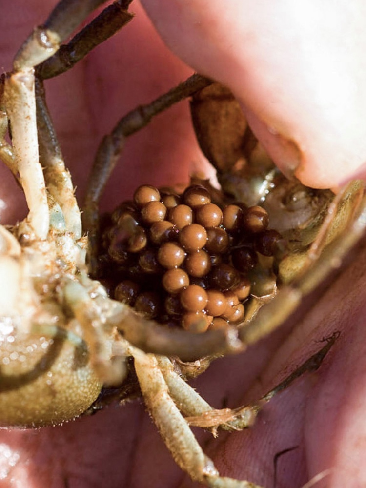 The breeding season for the White-clawed Crayfish is from September to November when the water is cooler, the females carrying the eggs under their tails all winter until releasing the hatchlings the next summer, this is when they are most vulnerable.