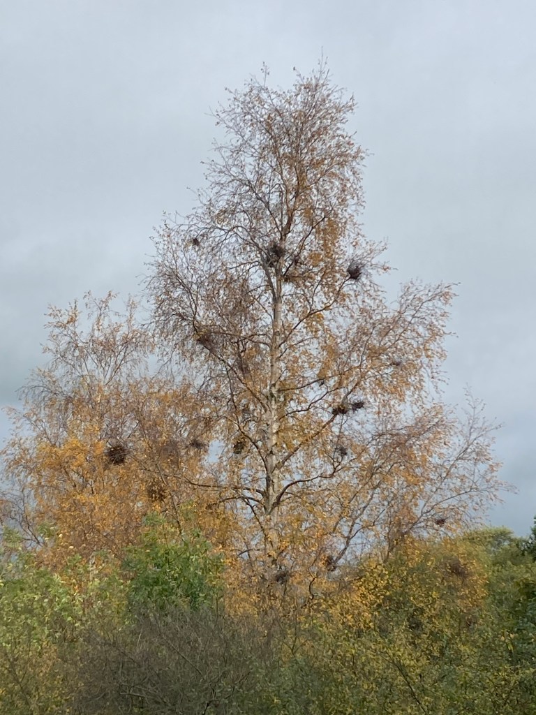 One species of fungi which infects the Silver Birch but does not kill it is a parasitic species, Taphrina betulina, called the Witch’s Broom fungus, as it caused abnormally dense growths of small twigs on the branches, which supposedly look like brooms, although they are more often mistaken for bird’s nests.