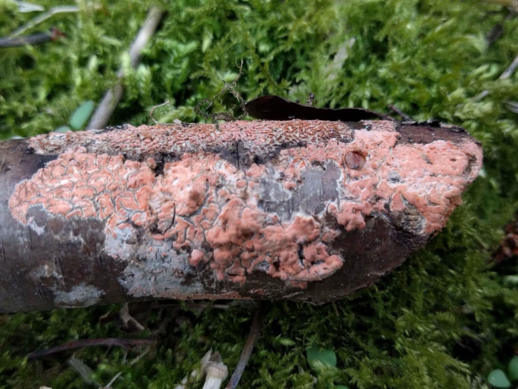 Peniophora incarnata or Rosy Crust fungus, upon which Witches’ butter grows