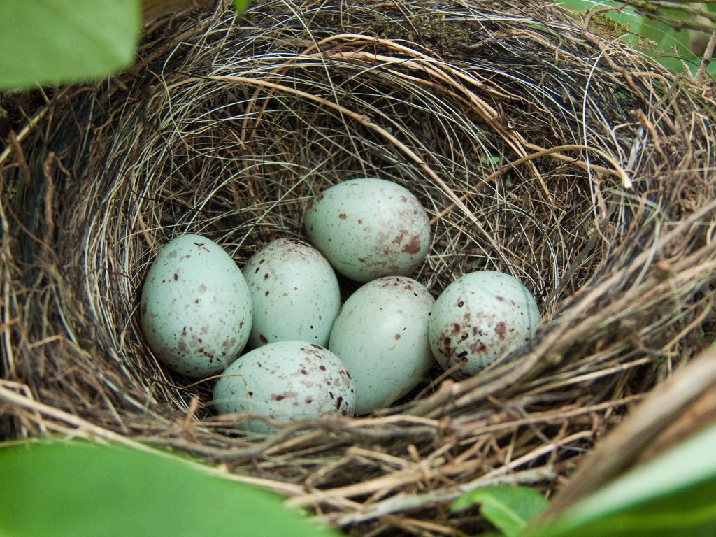 Nesting occurs in spring, when the female will build a neat, cup-shaped nest in dense and secluded cover. This meticulously assembled construction is composed of two sections; a foundation platform of small twigs and the nest itself, woven out of lichen, moss and similar materials and lined with a thick layer of roots, grasses or coarse animal hairs, in this nest she lays 4-7 eggs, which are a finely speckled pale green or blue.