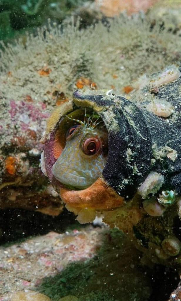 Tompots are curious and territorial, often peeking out of holes or crevices where they live and breed, with males guarding eggs laid inside.