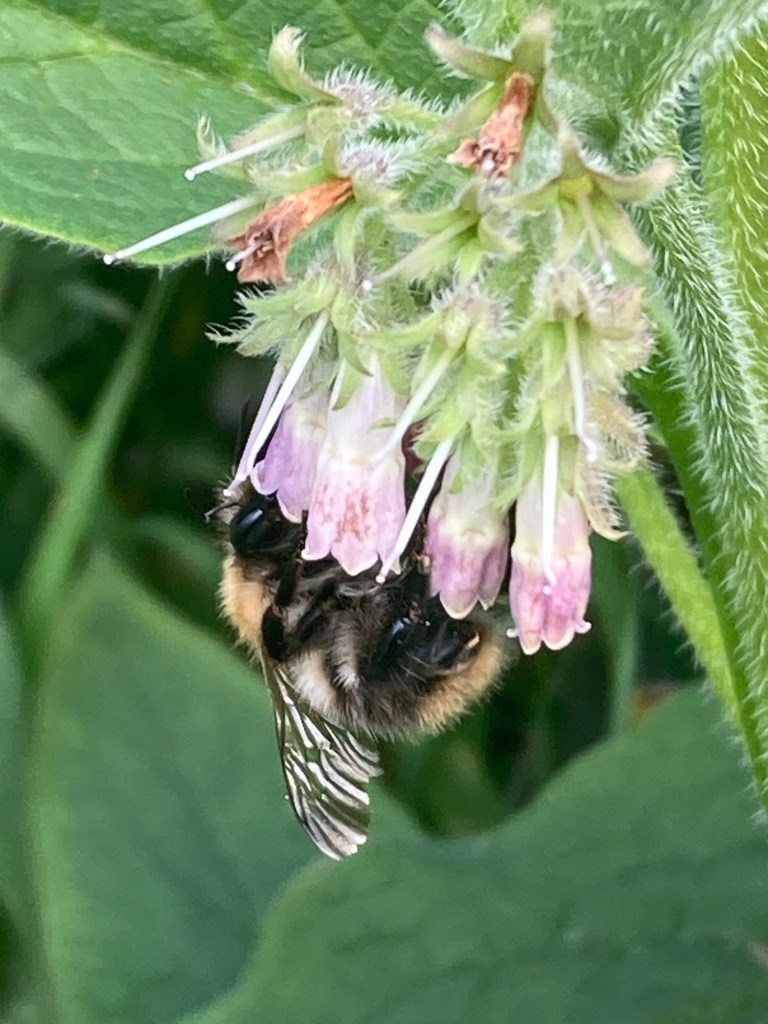 Botanically, Comfrey belongs to the Boraginaceae family, which includes well-known plants like Borage, another hirsute herb popular with pollinators, Alkanet, and Forget-me-nots.