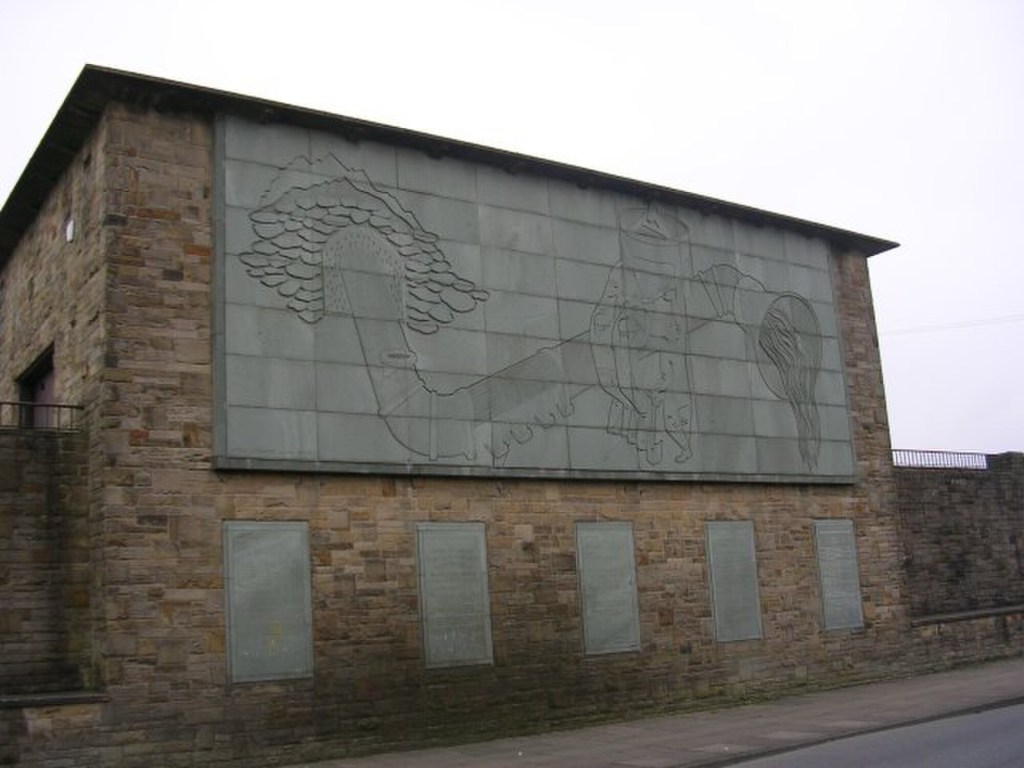 The aqueduct terminates here at Heaton Park Reservoir. The bas relief on the wall of this building depicts the pipeline. The plaques below the relief detail significant facts concerning its planning and construction