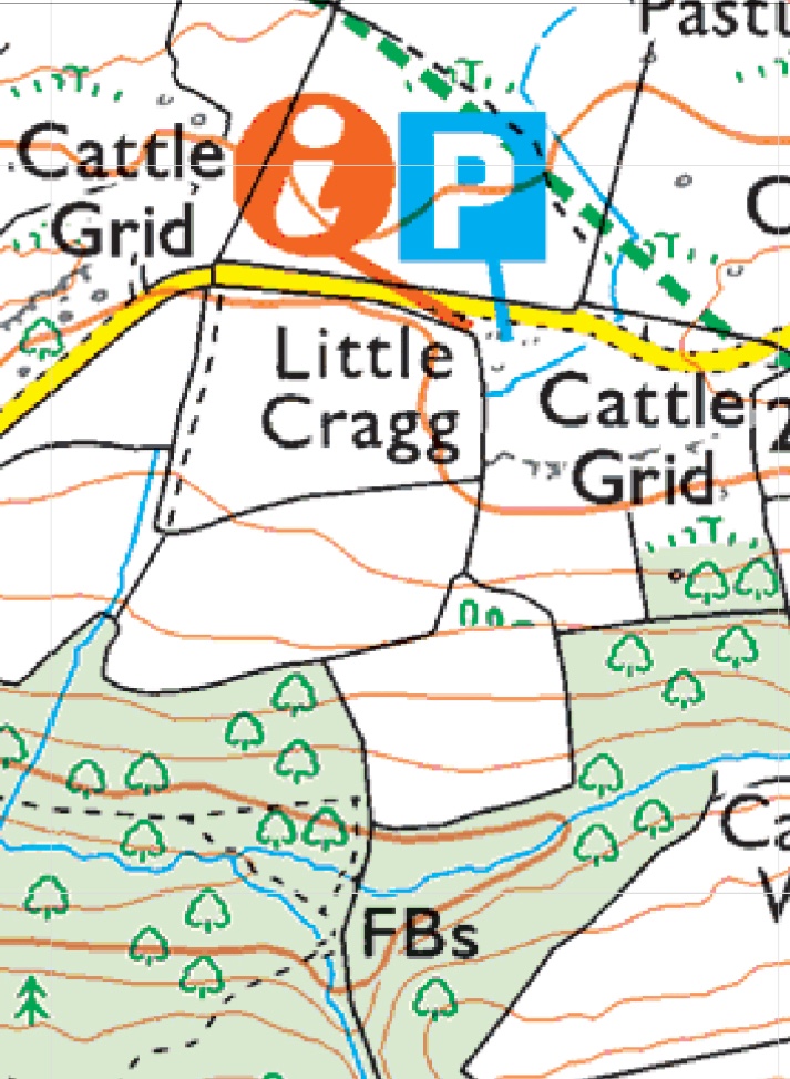 First walk from the car park along the road towards a farm called Cragg Farm, when at the cattle grid turn right and follow a footpath down towards Skelbow barn.
