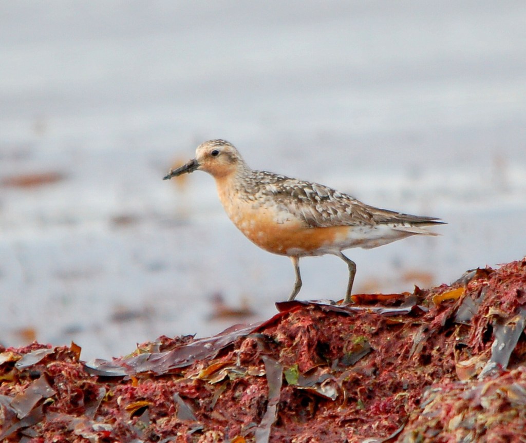 They are recognisable by their dumpy, short-legged build, and undergo a striking transformation between seasons. In summer, their chest, belly, and face glow a vibrant brick-red, while in winter, their primary season in Morecambe Bay, they sport a grey upper body and white underparts, with a faint wing-stripe visible in flight.