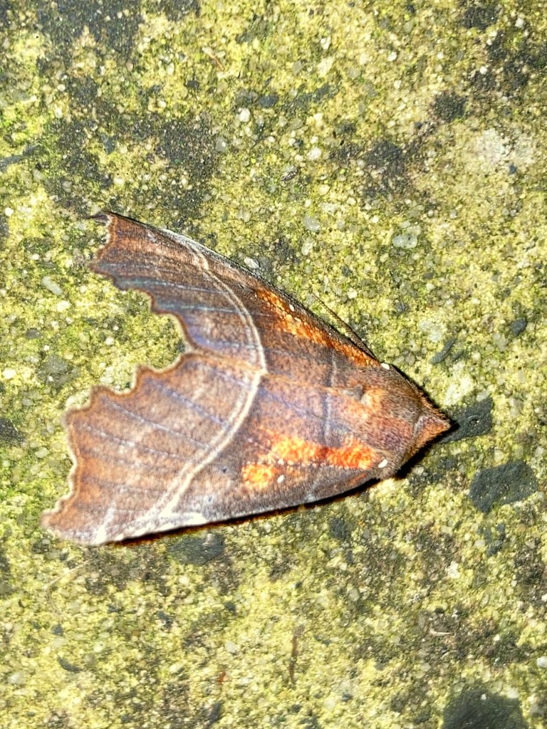 It is easily recognisable by its rich, reddish-brown forewings, which feature bold orange streaks and white spots, creating a flame-like pattern that stands out against its surroundings. The wings are scalloped along the edges, giving them a distinctive, wavy outline, and the moth holds them in a tent-like position when at rest. Adults typically have a wingspan of 40 to 45mm and the hindwings are paler, often grayish with subtle markings.