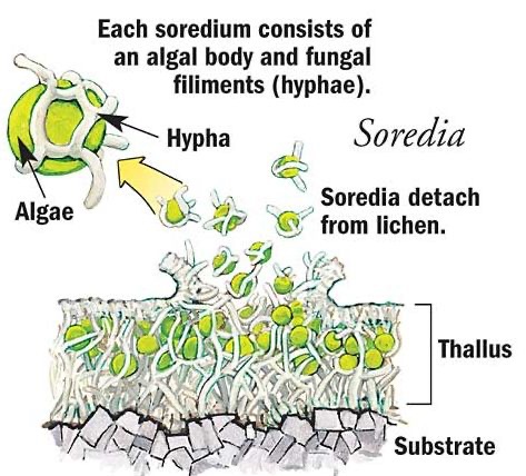 - Lobes: broad (5 to 20mm), rounded, often overlapping, margins usually bearing bright, lime-green granular soredia in crescent-shaped soralia (see diagram below)