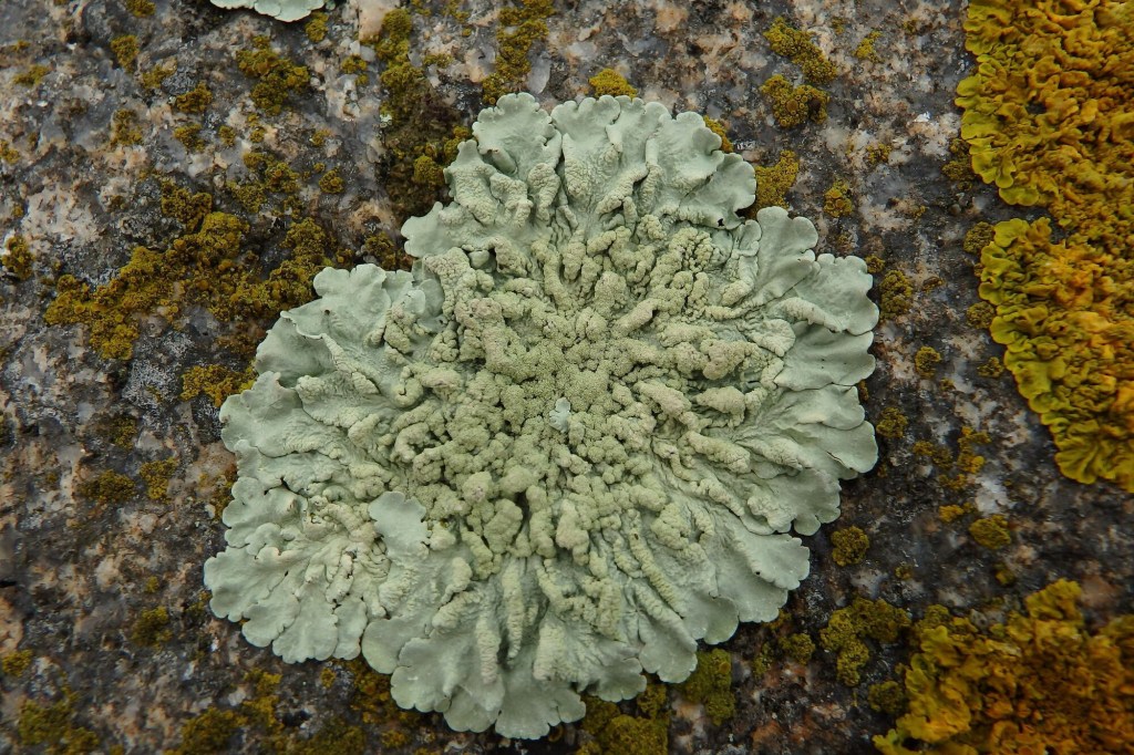 Flavoparmelia comes from the latin words flavus, meaning ‘yellow’, and parma, meaning ‘shield’, caperata is latin for ‘wrinkled’