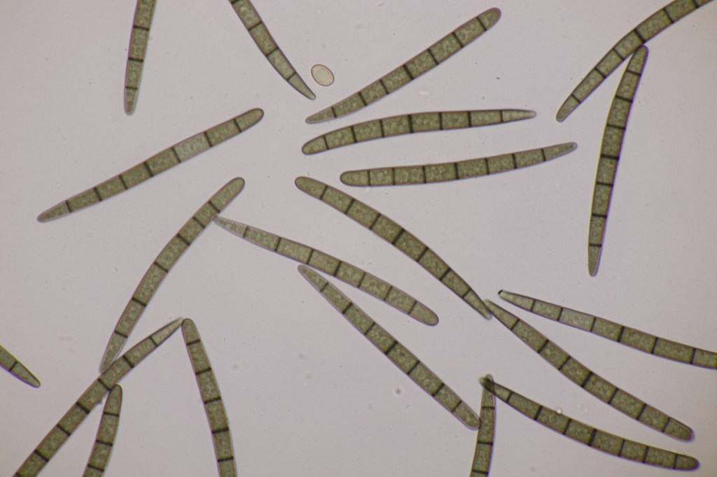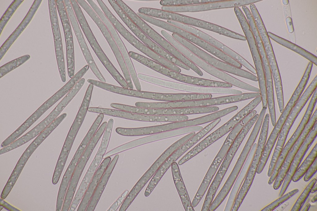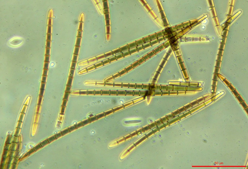 Its banana-shaped spores measure 52 to 71 μm, turning dark brown with 7 septa early on, and paraphyses feature a chain of swollen, pear-shaped cells at the tip.