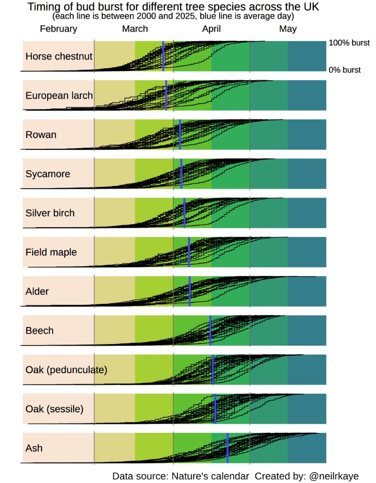 Recent decades of milder winters and warmer early springs have advanced budburst and flowering overall, sometimes by weeks in extreme years, though the north remains more conservative than the south.