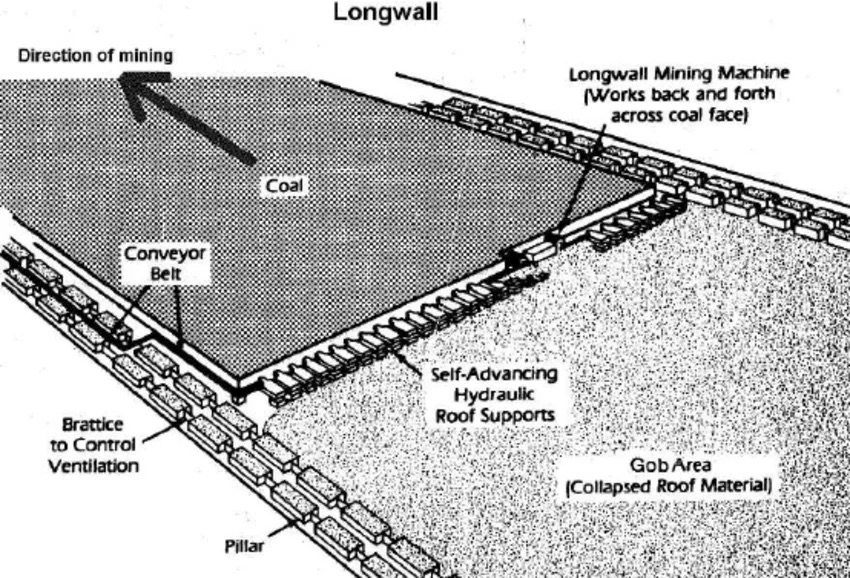 - Longwall: A method of coal mining where a long continuous face (often 300–900 feet) is worked in a single slice, with the roof allowed to collapse behind as the face advances; common in mechanised UK mines.