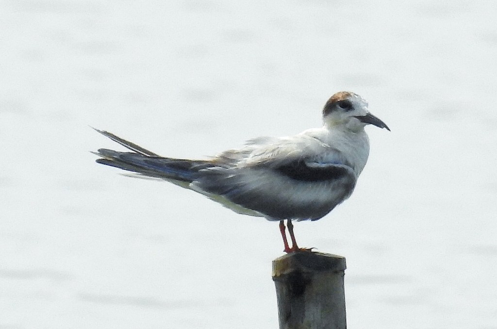 Adults are very smart and distinguished in their breeding plumage, sporting a silvery-grey back and upperwings, a clean white underbody, and a distinctive black cap. Their bill is long and orangey-red with a black tip, while their legs are short and red. In flight, they show a buoyant, floating style with narrow, angular wings, often hovering before plunging to catch prey.